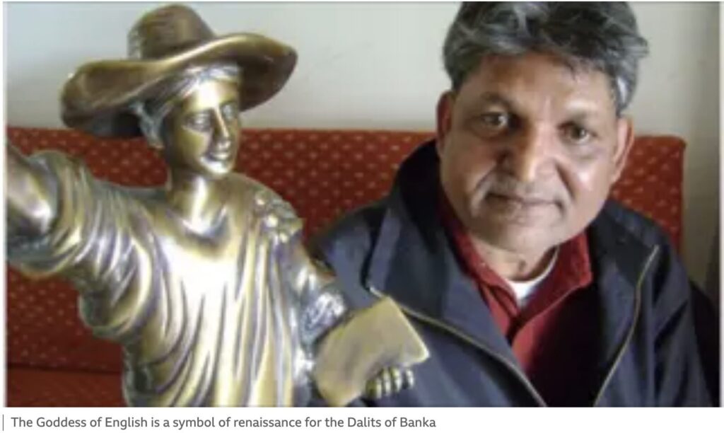 「英語を話すダリットが、溝や道路の掃除を期待されるだろうか?」と彼は問いかけた。「英語を話すダリットが、地主の農場で下働きをすることに満足するだろうか?」無神論者である彼は、英語をダリットのアイデンティティに組み込むためにこの女神を設計した。それによって、自分たちの人々を封建的で従属的な地位から、近代的で自立した地位へと押し上げようとしたのである。「英語を学ぶことは、世界がこれまでに見た中で最大の大衆運動となっている」と彼は書いている。